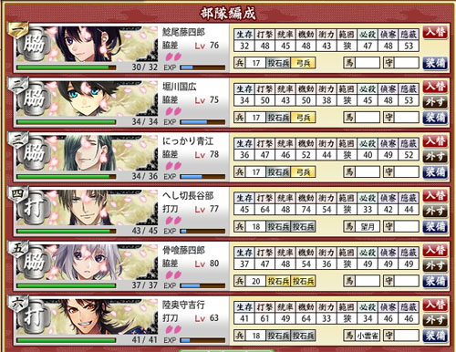 夜戦マップの高速槍程ではないけど、うちだと先制できるの長谷部さんと骨喰ちゃんと機動高い短剣くらいかも。