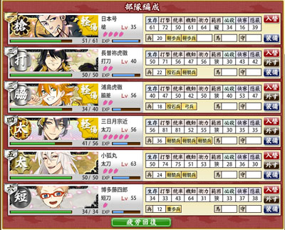 編成は二刀開眼を期待して機動の高い骨喰&長谷部コンビと蛍丸とレア太刀3で。