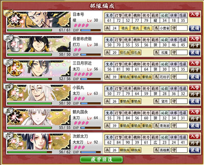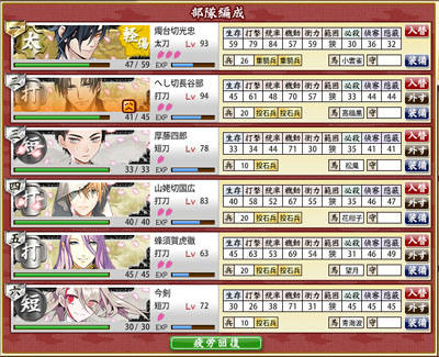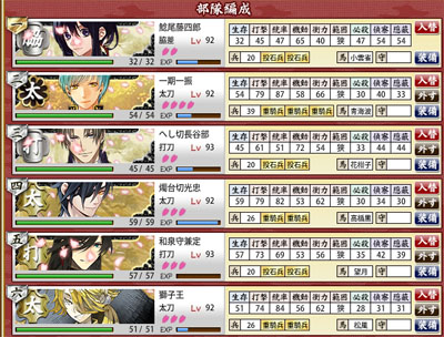 最初、脇差2、打刀3or2、太刀1or2の編成で行ってみましたが、ボスマス逸れるのが増えた感じだったので脇差1、打刀1or2、太刀4or3に変更。