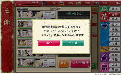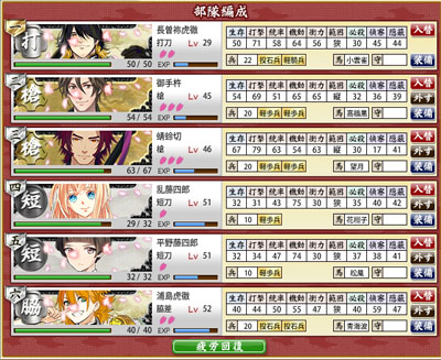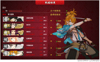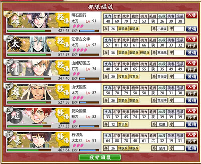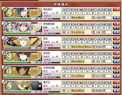 編成は遠征に出ていないLv90以上の太刀、脇差、大太刀、打刀の中で適当に組み合わせてます。