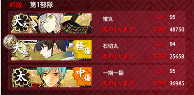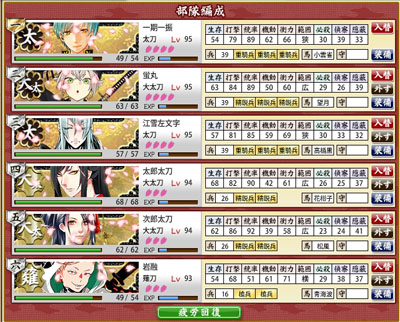 本日の編成。大太刀と薙刀を増やし、残りを3スロの太刀にして刀装もガチガチにしました。