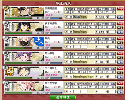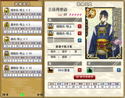 打刀と脇差に投石兵と馬、短刀は重歩兵馬なし、ボスマスの対高速槍に蛍丸(精鋭兵x3+望月)でA勝利取れました。