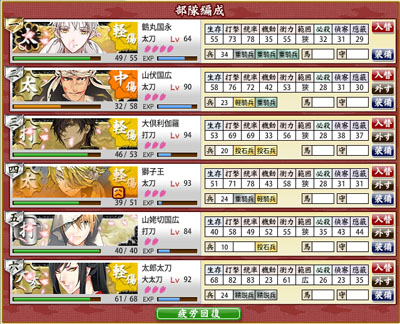 山姥切はレベリングで常駐、他は真剣必殺を期待して投入しましたが、